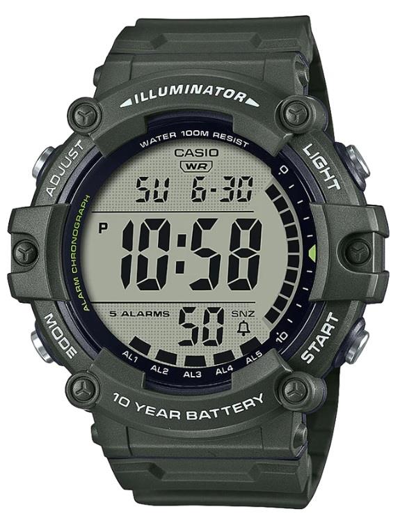 Casio Men's Digital Dark Karki Resin Strap Watch - AE-1500WHX-3AVDF Features A watch with style and functionality, plus an extra-long band for a more comfortable fit. Featuring a high-visibility, easy-read wide LCD, these watches also come with handy everyday features like stopwatch, alarm, and timer, not to mention water resistance up to 100 meters and a 10-year battery you won't have to worry about for ages. Specifications Case / bezel material: Resin Resin Band Resin Glass 100-meter water resistance LED backlight Afterglow Dual time 1/100-second stopwatch Measuring capacity: 23:59’59.99’’ Measuring modes: Elapsed time, split time, 1st-2nd place times Countdown timer Measuring unit: 1 second Countdown range: 24 hours Countdown start time setting range: 1 minute to 24 hours (1-minute increments and 1-hour increments) Other: Auto-repeat 5 multi-function alarms (with 1 snooze alarm) Hourly time signal Full auto-calendar (to year 2099) 12/24-hour format Regular timekeeping: Hour, minute, second, pm, month, date, day Accuracy: ±30 seconds per month Approx. battery life: 10 years on CR2032 Size of case : 54.4×51.2×15.7mm Total weight : 61g