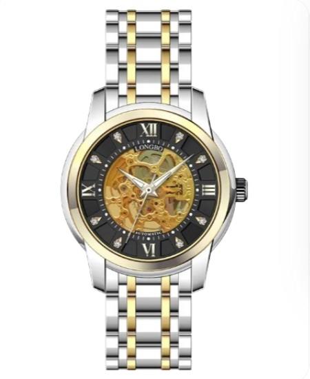 Longbo Mens Automatic Hollow mechanical Dial Analogue Gold/Black/2Tone Metal Bracelet Strap Watch