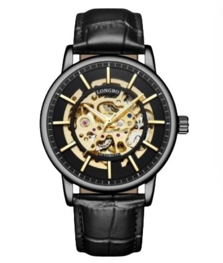 Longbo Mens Automatic Hollow mechanical Dial Analogue Gold Black Leather Strap Watch