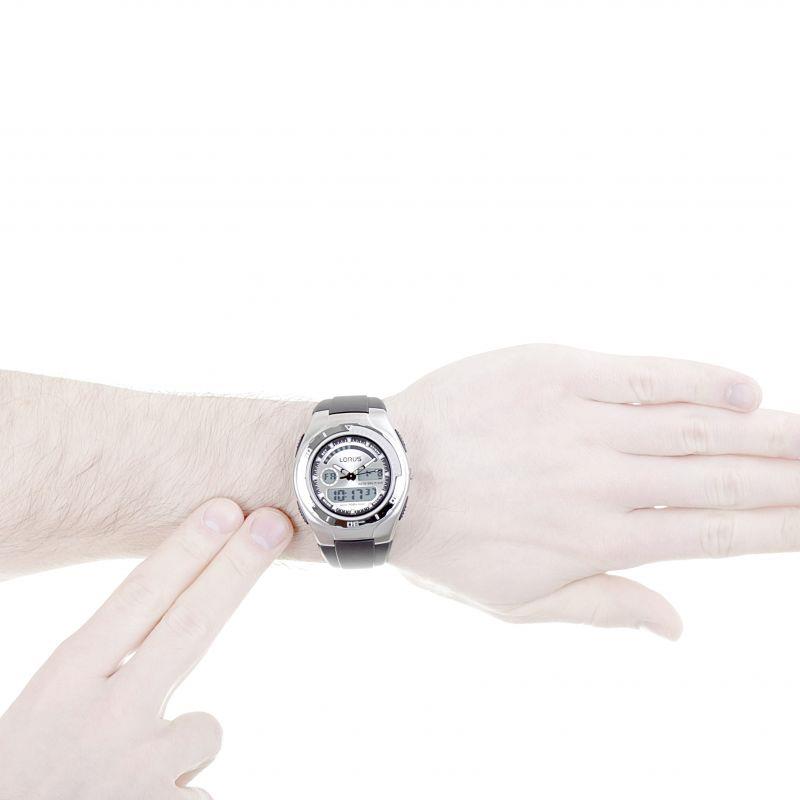 | Brand | Lorus | Alarm | Yes | Analogue/Digital | Combination | Backlight | Yes | Case depth approx. | 16.00mm | Primary Material | Stainless Steel | Case Shape | Circle | Case width approx. | 45.00mm | Chronograph | Yes | Clasp type | Strap buckle | Dial Colour | Silver | Gender | Gents | Movement | Quartz | Strap colour | Black | Strap Type | Rubber Strap | Water Resistance | 100 metres | BARCODE | 4894138314346 | Guarantee | 2 years |