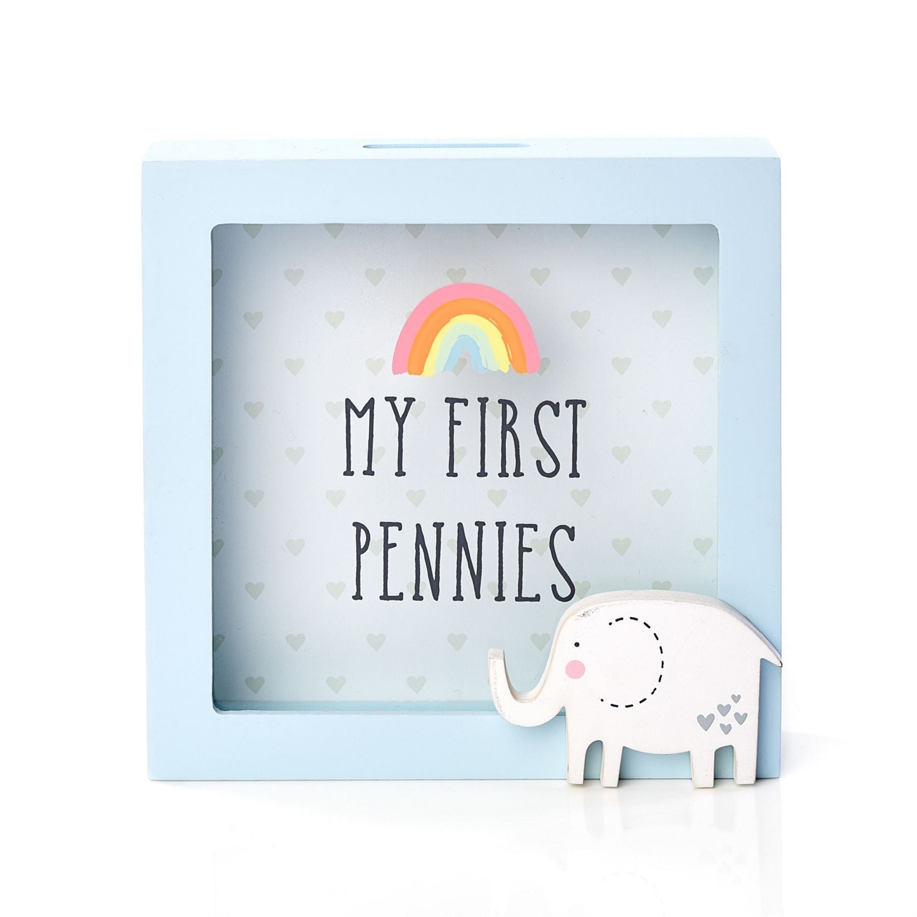 Help a sweet little one save their first pennies with this adorable money box. With a delicate blue and white design featuring an elephant and an uplifting rainbow, this accessory looks beautiful in a nursery. Details: - 'MY FIRST PENNIES' title - MDF and glass - 14.5 x 14.5cm - Blue and white - Money slot at the top - Colourful rainbow - Elephant feature