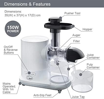 Fresh + Healthy Juices in their purest form Wattage: 150W Voltage 220-240V~60Hz Cord Length: 1M Noise: Below 60dB Speed: 85rpm