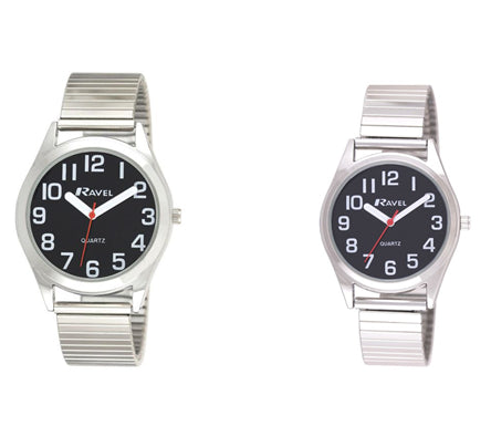 All Ravel expander watches are fitted with crown stoppers to protect battery life and are packed in a clear Ravel hanging pouch with guarantee card.