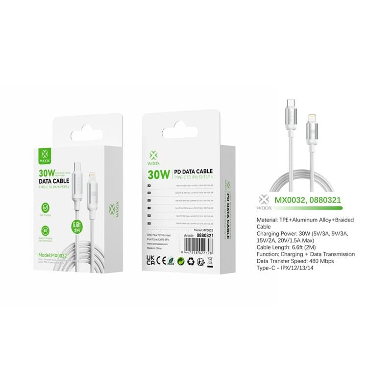 Woox Type C to Lightning Braided Data Cable, 30W - 5V/3A, 9V/3A, 15V/2A, 20V/1.5A Max, 1m/2m, White/Black