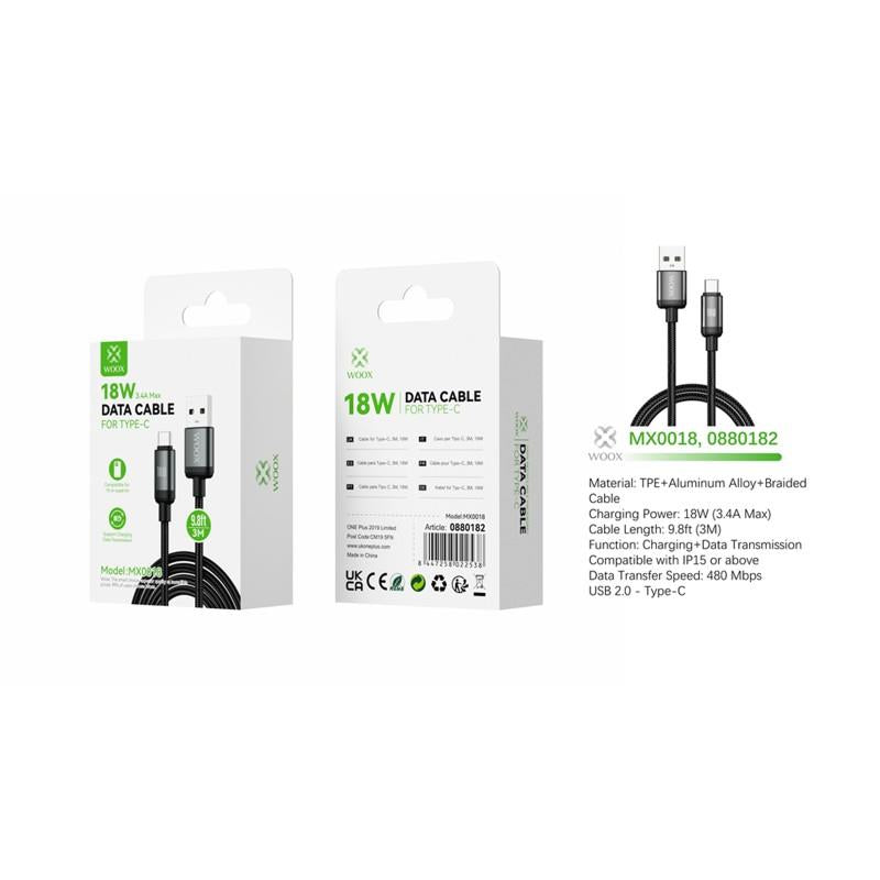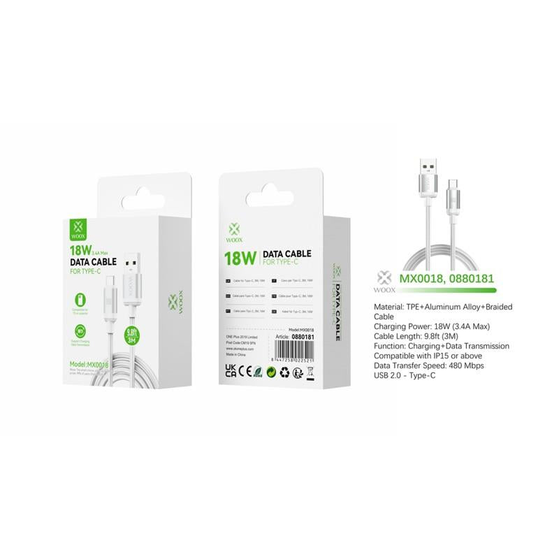 Woox USB to Type C Braided Data Cable, 18W 3.4A Max, 9.8ft 3m, White/Black