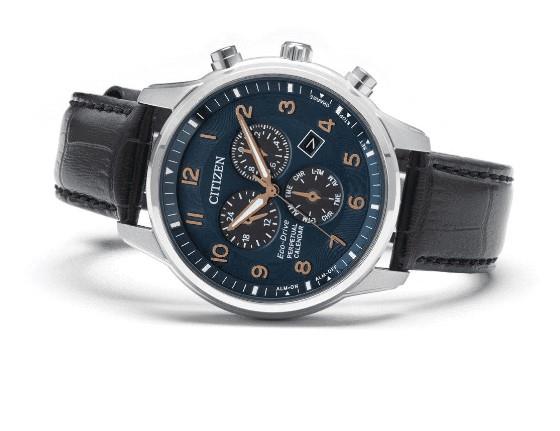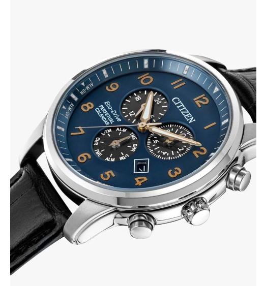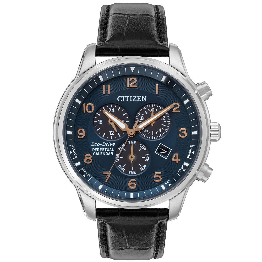 Citizen Men's innovative Eco-Drive technology, this stylish men's watch is a perfect balance of style and function. Featuring a perpetual calendar so you will never have to change the date, a chronograph and alarm. This handsome watch is finished with a striking blue dial and genuine black leather strap. Citizen Eco-Drive technology harnesses the power of light from any natural or artificial light source and converts it into energy which is stored in a permanently rechargeable lithium-ion cell.