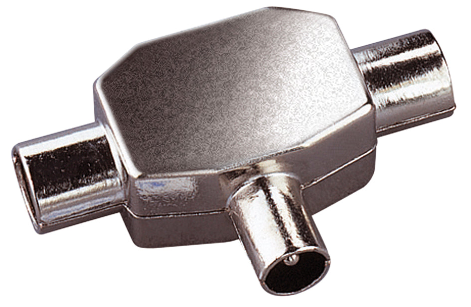 Coaxial T Splitter with Line Plug Input to 2 Coaxial Line Socket Outputs (Metal)