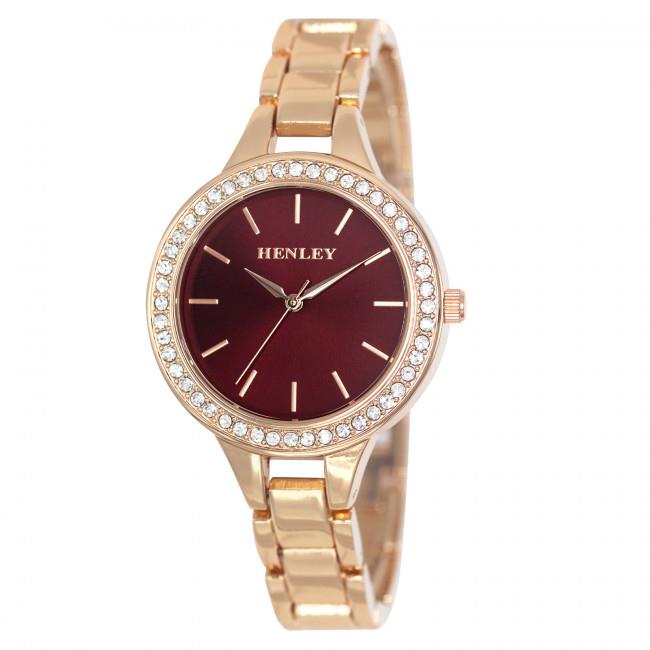 The Henley Ladies H07323 is a popular selection that you will need in your collection. The polished case is set with diamante crystals that perfectly compliments the polished case and soft sun-ray dial with complimenting hour index highlights. The bracelet is further enhanced by a double buckle for easy adjustment. Available in silver, gold, rose gold/deep red and rose gold/deep blue.