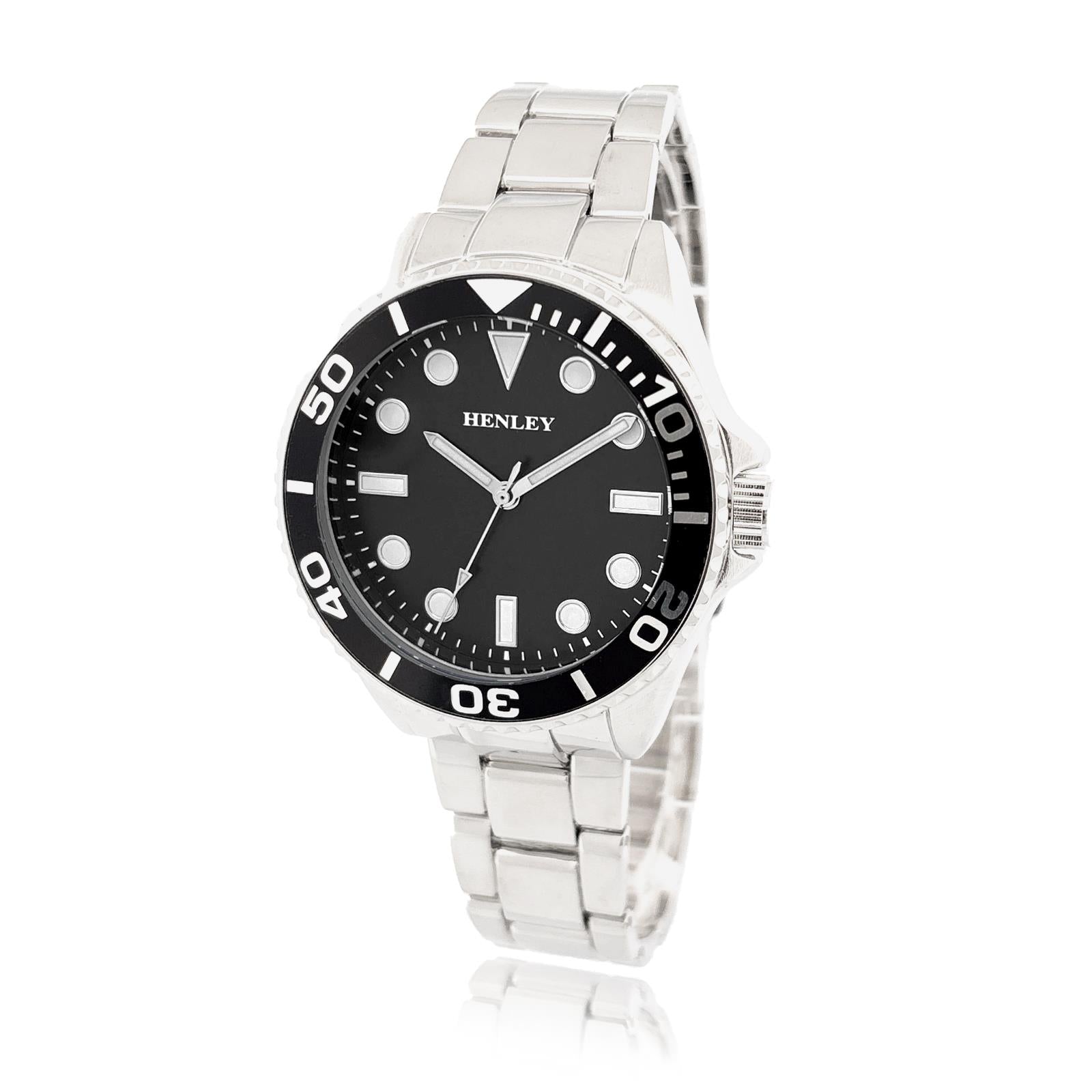 Henley Mens Fashion Round Case Dial with Black Top Ring Silver Plated Bracelet Watch H04002 Available Multiple Colors