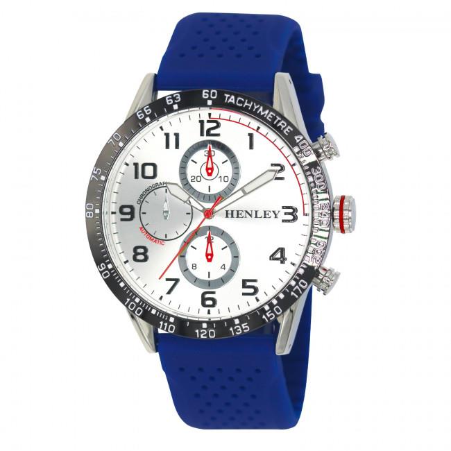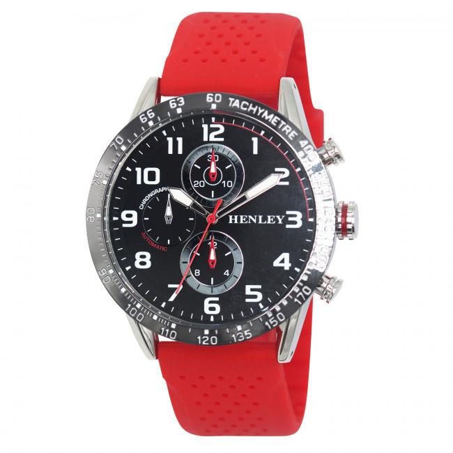 H02225 is a large polished sports watch with decorative push buttons and featuring a black top ring. This watch has an eye catching colour co-ordinated dial with decorative mini eye dials. Silver sports hands with colour co-ordinated second hand. Smooth colour co-ordinated silicon. Available in black, blue, red and grey. All Henley Mens fashion watches come packed in the deluxe Henley Mens mink / grey presentation gift box.
