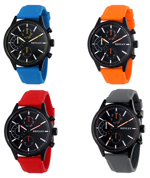 Large Satin Black Round Sports Case - 45mm. Black Dial Featuring Black Mini Dials with White and Coloured Highlights Black Sports Hands with White Infill and Coloured Tip Detail and Black Second Hand with Colour Co-ordinated Tip. Soft Coloured Silicon Sports Strap. Japan Quartz Movement. Henley Presentation Gift Box.