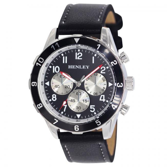 A fresh looking polished silver tone sports watch with decorative push buttons. The striking top ring makes this watch really stand out, with the contrasting coloured dial and eye catching sunray silver multi eye dials. Silver sports hands with red tip detail to complete the must have watch. Comfortable semi padded faux leather strap with coloured stitching. Available in black, silver and navy blue. All Henley Mens fashion watches come packed in the deluxe Henley Mens mink / grey presentation gift box. Product Specialisation: Polished Round Sports Case with Coloured Top Ring - 44mm. Coloured Dial Featuring Cosmetic Sunray Silver Multi Eye Dials. Silver Tone Hands with White Infill and Red Tip Detail with Matching Silver Second Hand and Red Tip. Faux Leather Sports Strap with Coloured Stitching. Japan Quartz Movement. Henley Presentation Gift Box.