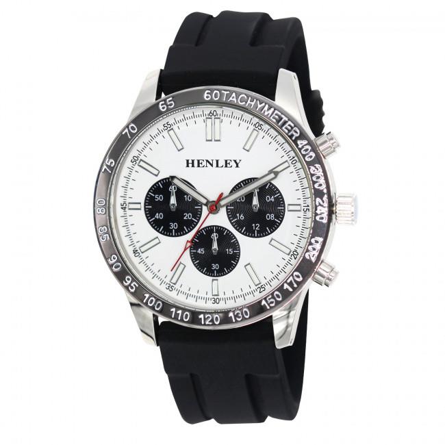 Stylish polished sports watch with decorative push buttons and black top ring. This watch has colourful sporty dial with attractive contrasting black mini eye dials. Silver sports hands with red second hand with a white infill detail to complete the must have watch. Smooth black silicon. Available in silver/blue, silver/orange, silver/red and silver/grey. All Henley Mens fashion watches come packed in the deluxe Henley Mens mink / grey presentation gift box.