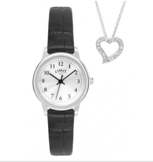 Limit Ladies Fashion Black Faux Leather Strap Watch and Silver Pendant Gigt Set