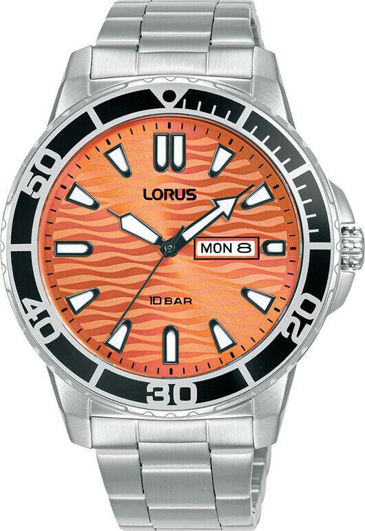 Lorus Mens Sports Day Date Orange Dial Seigaiha-mon With Stainless Steel Bracelet Watch RH361AX9