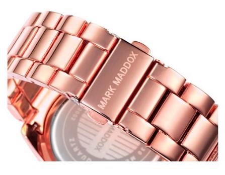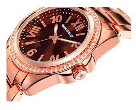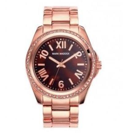 Mark Maddox women's watch, Pink Gold collection, reference MM3017-43. Fantastic pink IP model with a chocolate brown dial and bezel set with gems. It features three hands and a fully pink IP bracelet. Water resistance to 30 meters (3 ATM).
