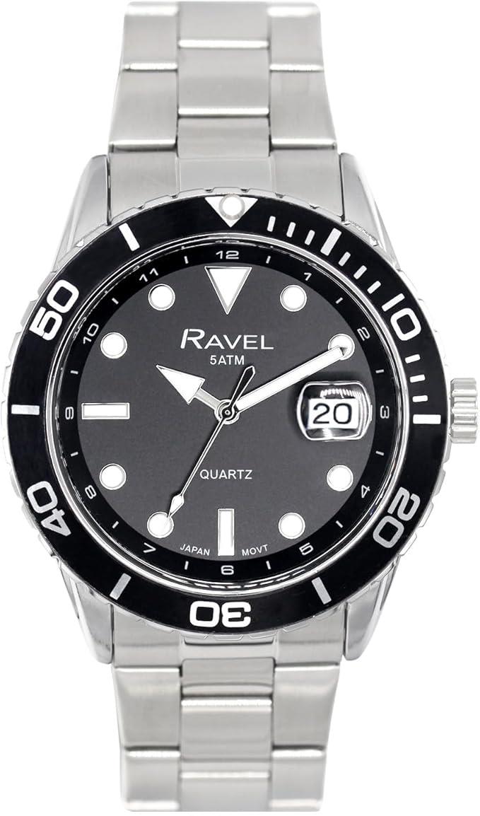 Ravel Plus series men's 5ATM calendar watch is made with a high-grade 42mm silver-tone case with a uni-directional rotating bezel with silver printed numbers and a stainless steel case back. Inside the case, is a finely finished matt black dial, printed inner ring, and bold circular white hour markers that are easy to see at a glance.