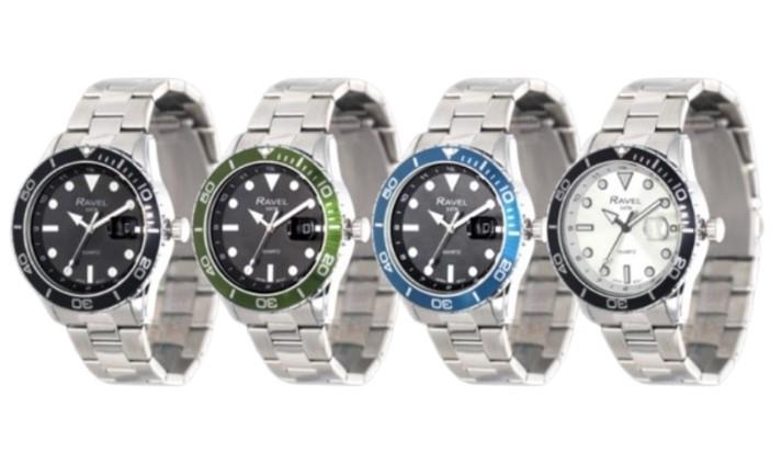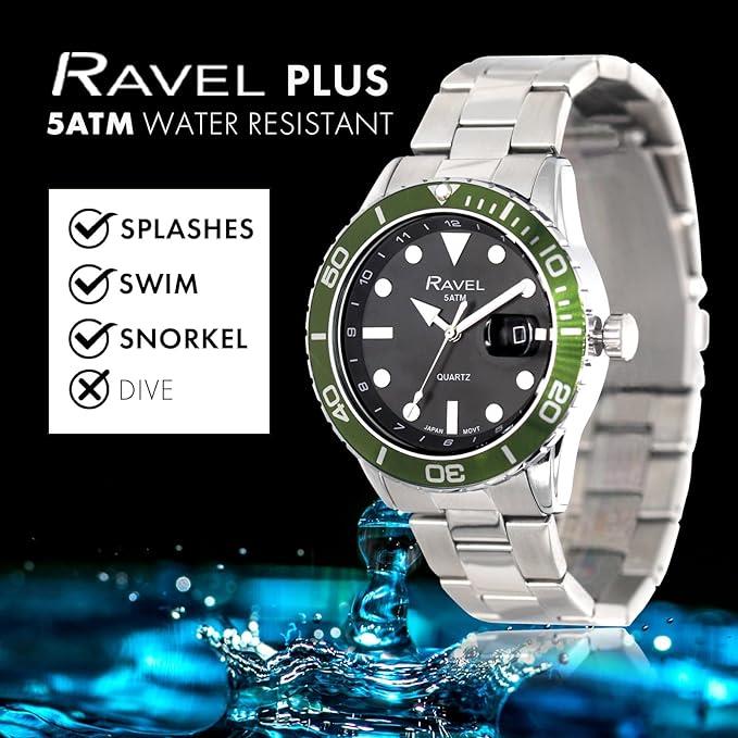 Ravel Mens Fashion Sports 42mm Round 5ATM Dated Dial Uni-Directional Bezel Silver Plated Bracelet Watch RPD-MB Available Multi Colors