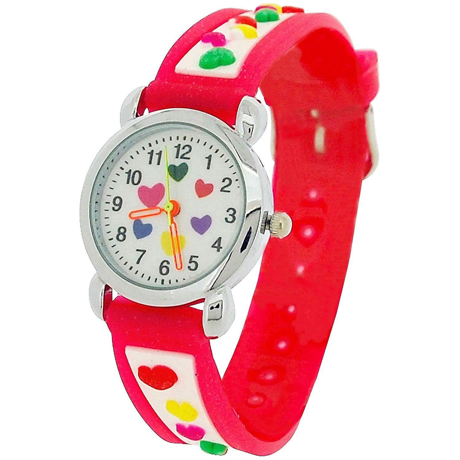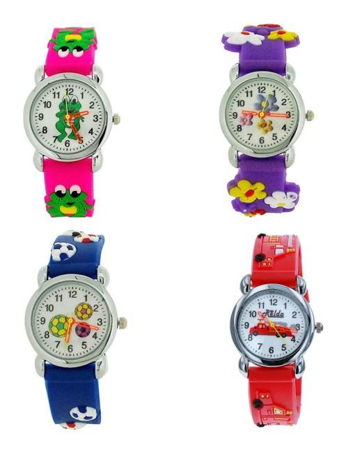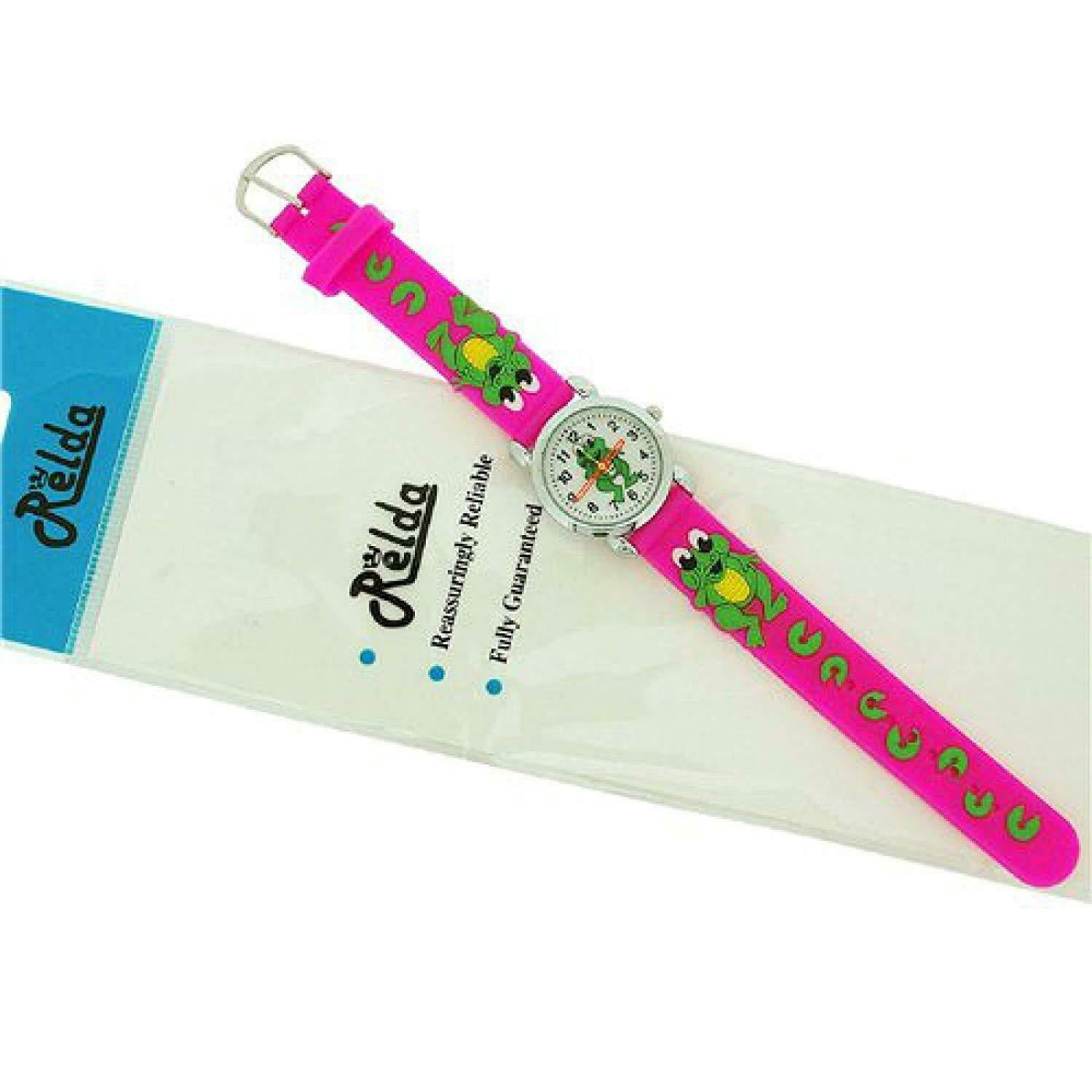 Relda Children's Analogue 3D Silicone Strap Girl's Watch A simple and fun children's analogue watch by Relda, this is an easy to use wrist watch that functions to a high capacity, suitable a young boy. This watch is an ideal gift for boys. Product Features: * Quartz movement. * Hour, minute and second hands. * Bold numbers for easy read. * Adjustable buckle closure. Strap Measurements: This watch fastens with a buckle on any of the 8 holes. * Length from one end of strap to the other: 19.5cm. * Length when fastened on tightest hole: 14cm. * Length when fastened on loosest hole: 18cm. * Width: 1.5cm Case thickness: 0.6cm Case diameter: 2.8cm Also Comes With: * 1 year manufacturers guarantee.