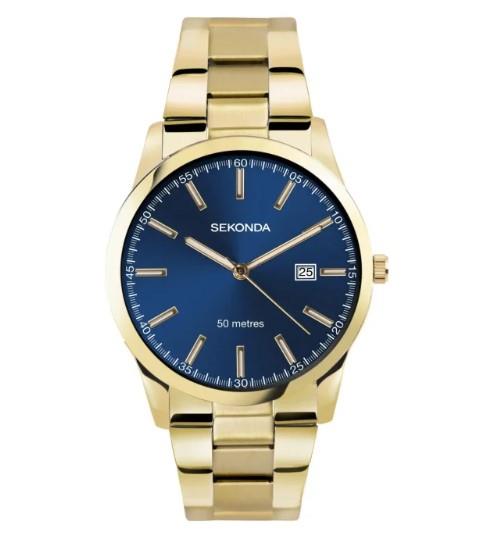 Sekonda Mens Fashion Dated Blue Dial Gold PVD Stainless Steel Bracelet Watch