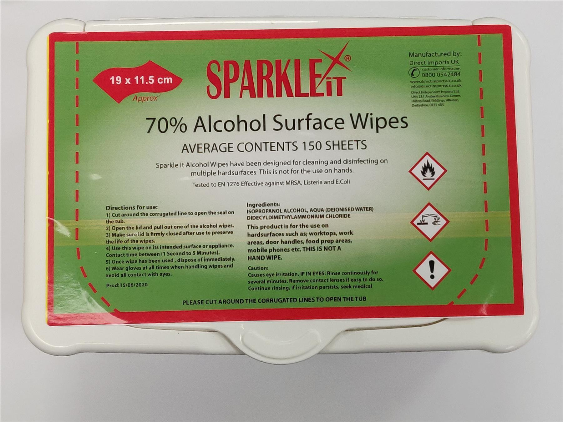 150 sparkleit 70% alcohol wipes quantity: 150 sheets. Alcohol pregnated wipes have been formulated and manufactured to comply with en 1276 to help fight againt mrsa, e-coli, listeria and much more. These wipes have been pregnated with 70% propanol-2. (isopropanol alcohol). Material: non woven fabric.