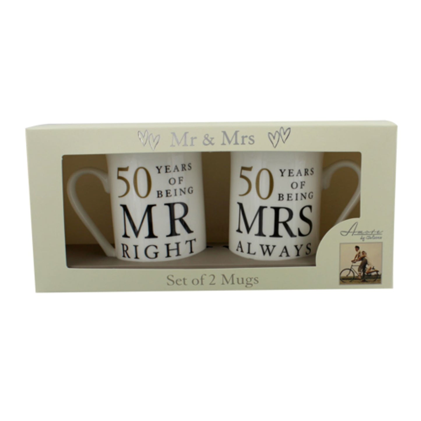 A beautiful 50th Anniversary gift pair of ceramic mugs from AMORE BY JULIANA�. This set features '50 Years of Being Mr Right/Mrs Always Right' design with gold foil numbers and comes complete with luxury gift box. STONEWARE - Tougher than earthenware and chip resistant. Stoneware is ideal for heavy use. Suitable for microwave or dishwasher.