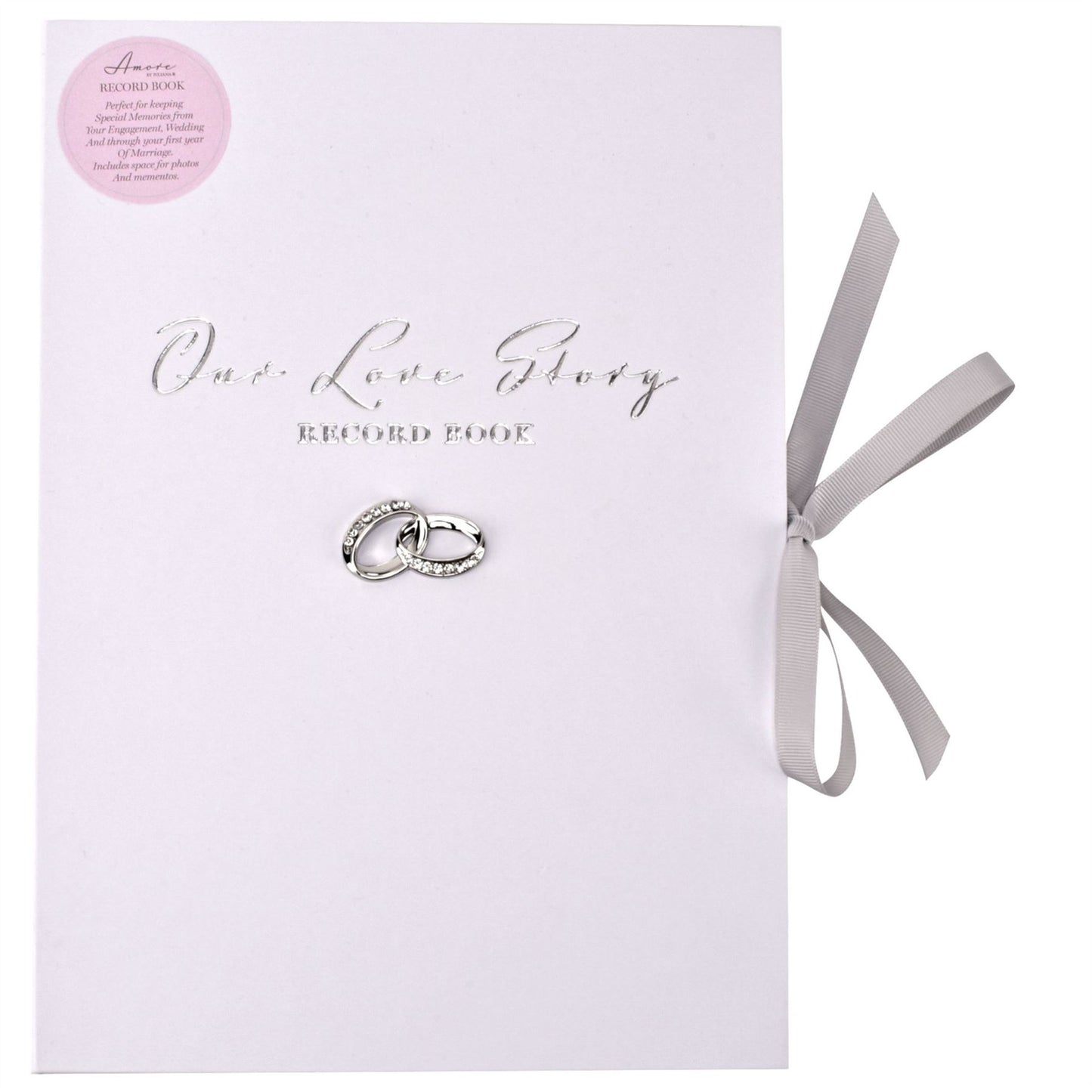 Keep a record of the journey to your special day with this Our Love Story record book. From AMORE BY JULIANA� - timeless giftware to celebrate the enduring wonder of love. Details: - Gorgeous crisp white binding - Silver foil embossed Our Love Story Record Book title - Twinkling crystal encrusted silverplated rings icons - Silver grosgrain ribbon tie - Spaces for photos from various relationship milestones - Lined annotation spaces The perfect engagement gift to a bride to be.