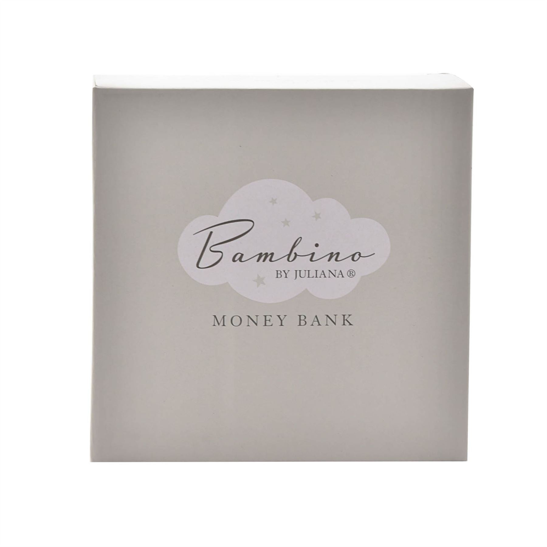 A moon shaped resin money box from BAMBINO BY JULIANA�. This wonderful keepsake provides glistening decoration for the nursery of new family arrivals which will be cherished eternally. The silver resin money box is adorned with silver �Dream Big, Little One� decal, debossed features and beautiful crystal embellishments. It is completed by a large money slot to the rear for saving coins and an easy-to-remove rubber bung on the base. The money box is packaged in a branded closed box.