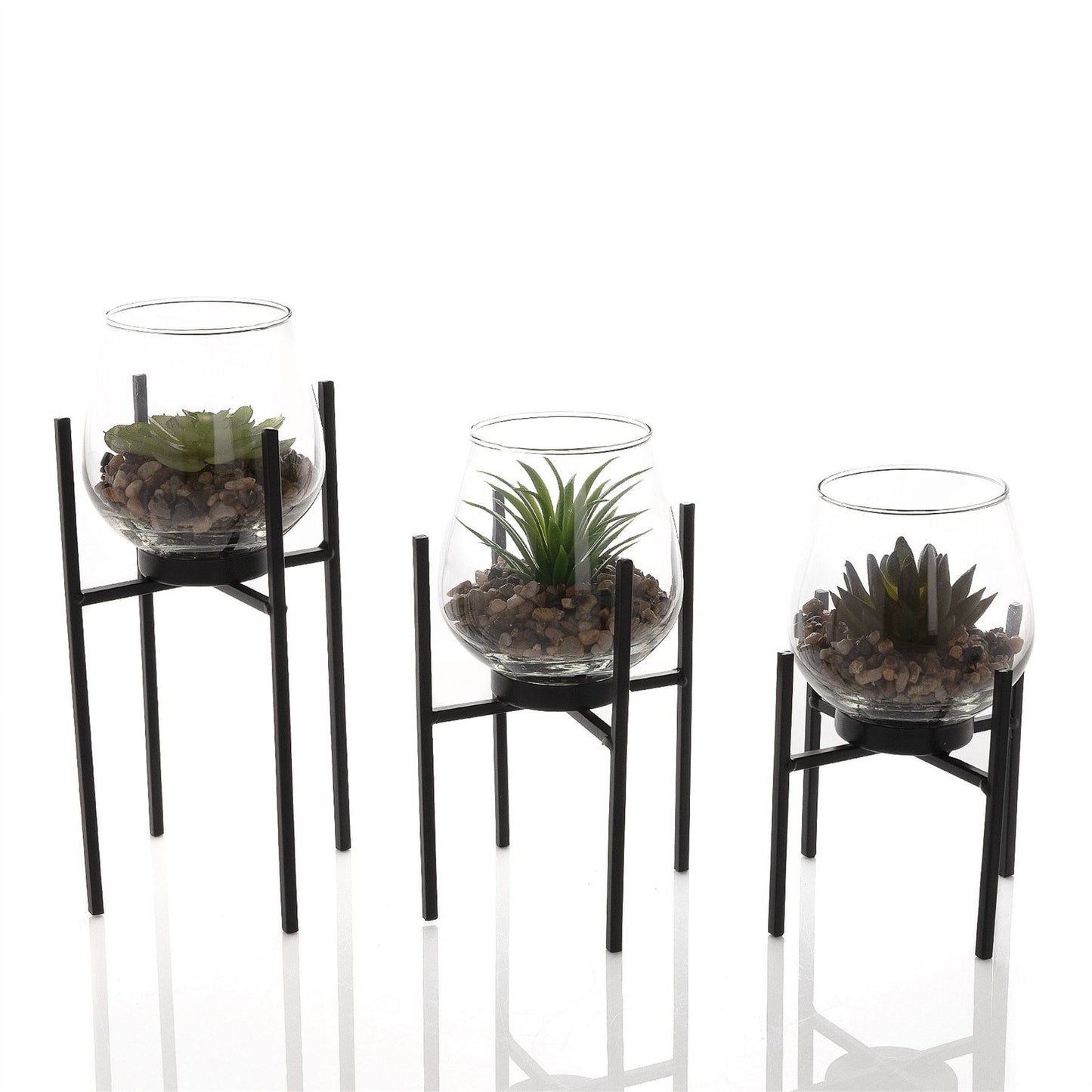 Refresh your home with this contemporary set of 3 metal and glass planters. In three sizes, these energy-bringing pieces can be displayed together or separately throughout the home. Details: - Set of 3 glass planters - Faux succulents - Glass and metal