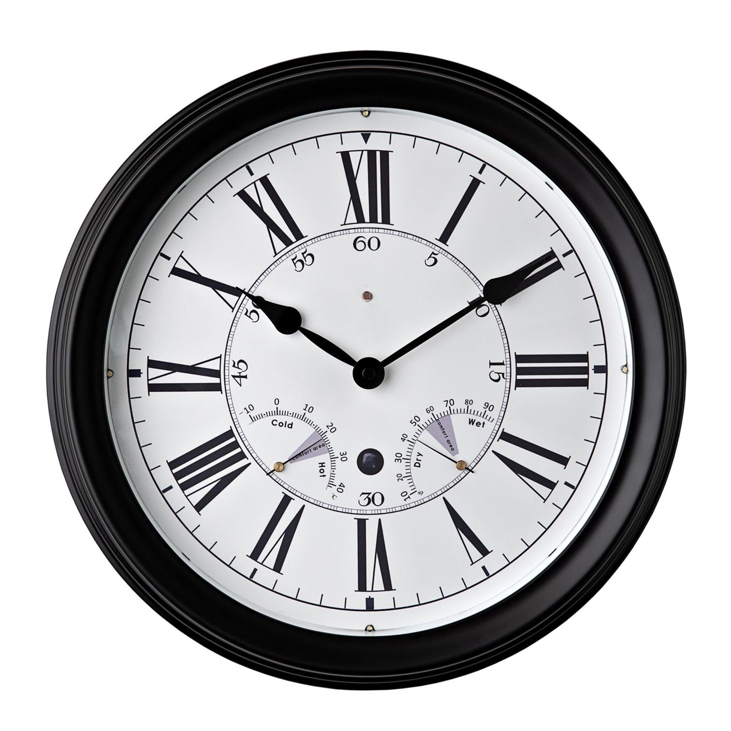 The clock features Grey, Black & White plastic - highlighting its bold, white clock face - which is furthered by its inset temperature and weather dials. Its sound-controlled LED light Roman dial showcases clear numbering and is finished by both spade and contemporary clock hands.