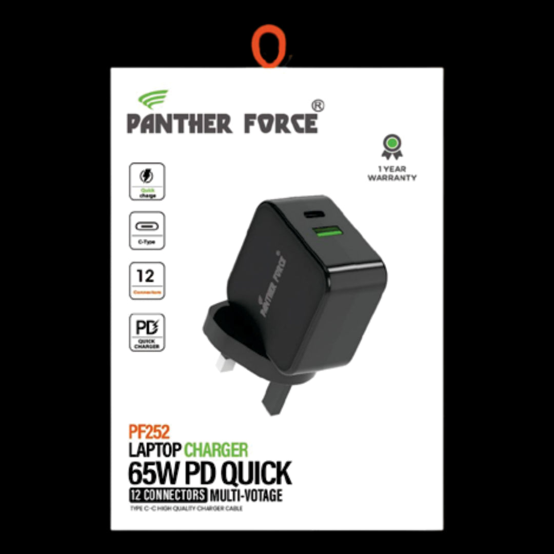 Power up your productivity with the Panther Force 65W Type-C Fast Laptop Charger engineered for speed, safety, and universal compatibility. Whether you're working, gaming, or on the move, stay fully charged with reliable performance and intelligent power delivery.