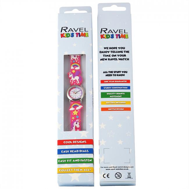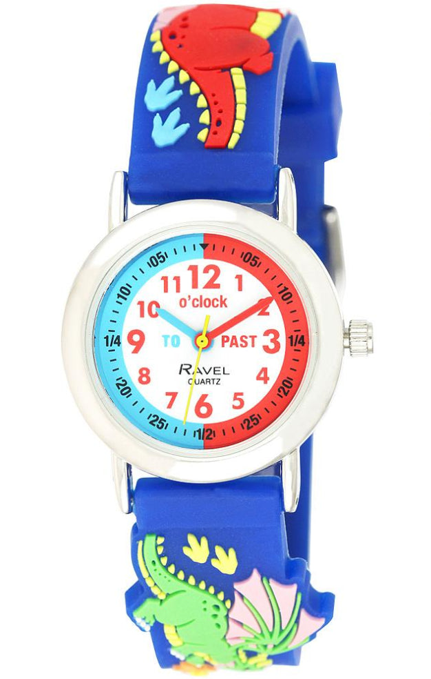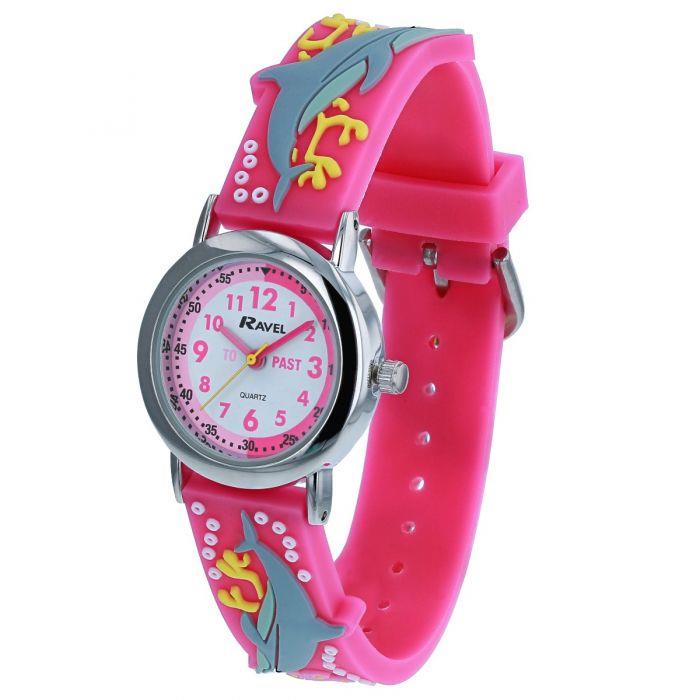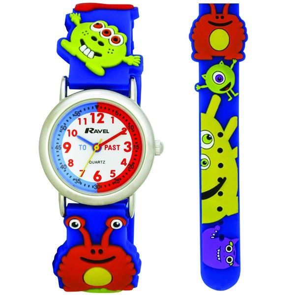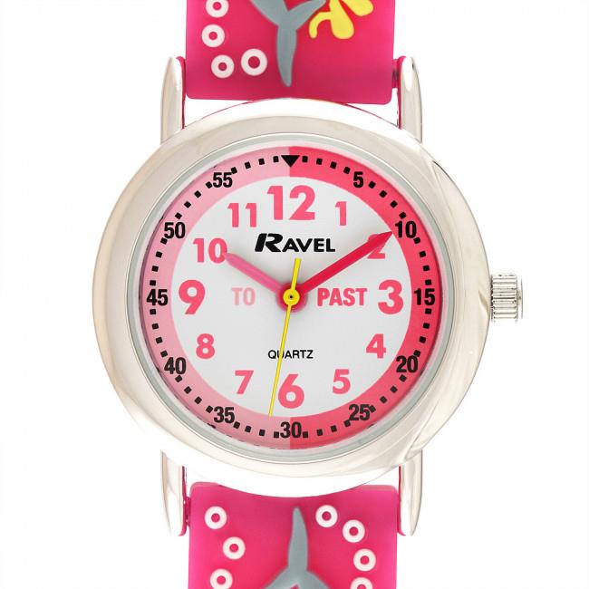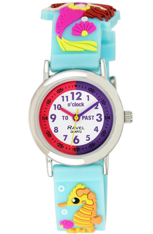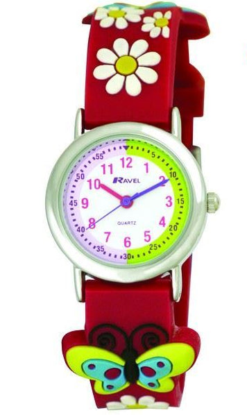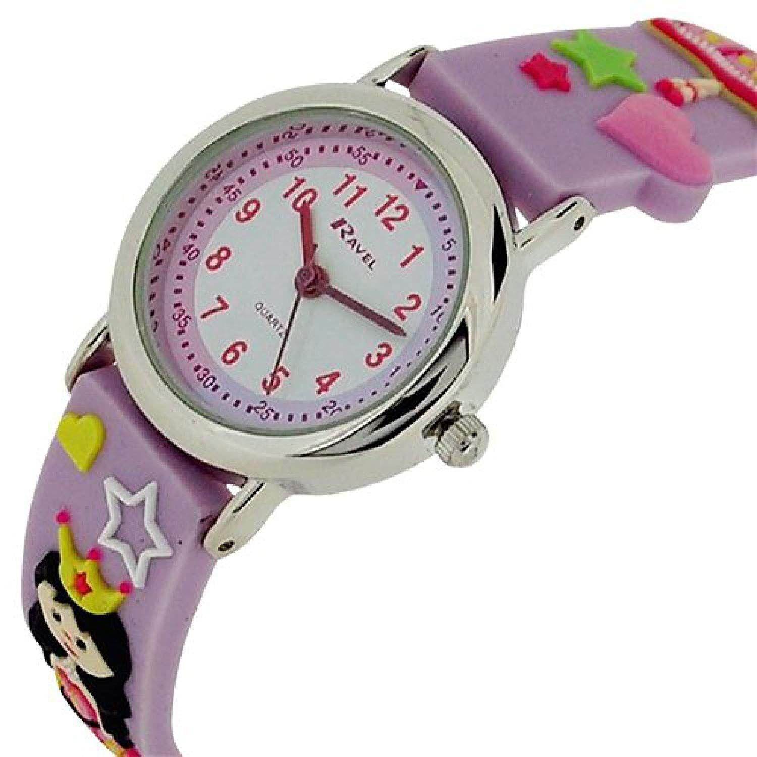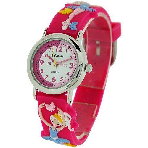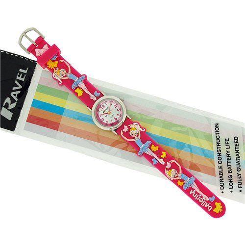 Ravel Children Girls & Boys 3D Cartoon Time Teacher Watch Available Multicolour & Design Strap R1513 The Ravel Rascal Time Teacher range is the perfect watch to help teach children to tell the time with. Made using a soft silicon strap with high quality 3D childrens designs and a colour co-ordinated time teacher dial this watch will help demonstrate the difference between "to" and "past." It has a numbered minute track with a full 1-12 dial and coloured hour and minute hands to make learning to tell the time as easy as possible. The R1513 comes in this new fantastic cartoon ballerina design. All Ravel Kids Time Teacher watches are fitted with crown stoppers to protect battery life and are packed in a clear Ravel hanging pouch with guarantee card. Watch Description Polished Silver Round Case - 27mm. Full Arabic Colour Co-ordinated Time Teacher Dial and Hands. Silicon Strap with High Quality 3D Graphics. Fits the Smallest Wrists. Quality Quartz Movement. Packed in Ravel PVC Hanging Pouch with Guarantee Card.