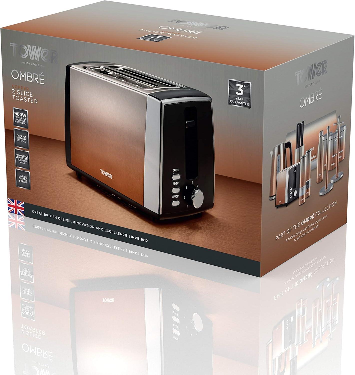 Start your morning off with the delicious smell of toast, crumpets or muffins using the Tower Infinity Ombre 2-slice toaster. Presented in quality stainless steel with metallic copper shading, the contemporary-style toaster brings added dimension in your kitchen. It features 2 toasting slots to provide enough space for various sized slices, while the adjustable browning control's 7 different settings let you select your ideal browning consistency. The self-centring function offers crisp, even re sults, complete with defrost and reheat options to give you more control over the toasting cycle. An anti-jam function and automatic turn-off function ensures safe operation during use. The Ombre toaster includes a removable crumb tray and integrated cord storage to provide easy cleaning and neat storage to keep your countertop tidy. Start your morning off with the delicious smell of toast, crumpets or muffins using the Tower Infinity Ombre 2-slice toaster. Presented in quality stainless steel with metallic copper shading, the contemporary-style toaster brings added dimension in your kitchen. It features 2 toasting slots to provide enough space for various sized slices, while the adjustable browning control's 7 different settings let you select your ideal browning consistency. The self-centring function offers crisp, even results, complet e with defrost and reheat options to give you more control over the toasting cycle. An anti-jam function and automatic turn-off function ensures safe operation during use. The Ombre toaster includes a removable crumb tray and integrated cord storage to provide easy cleaning and neat storage to keep your countertop tidy.