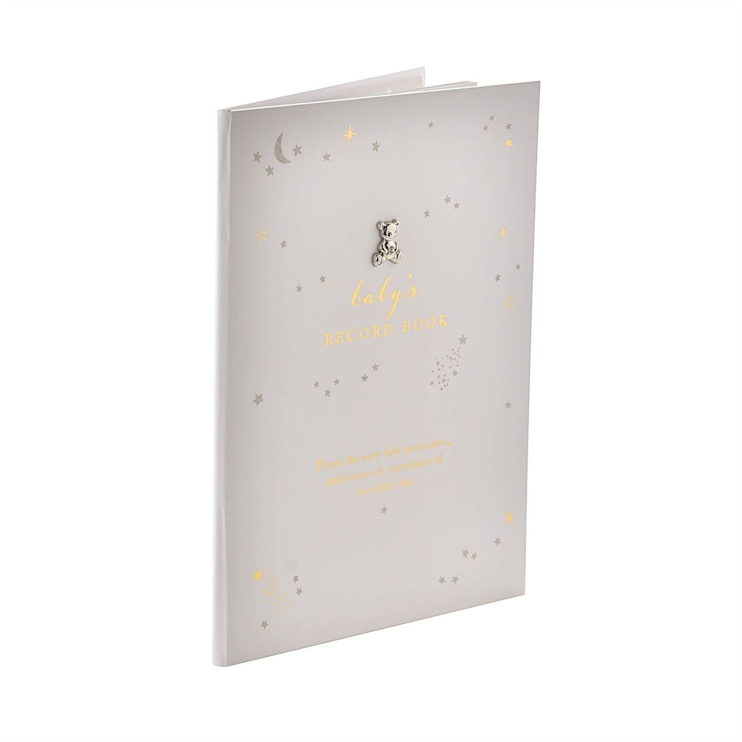 A baby record book from BAMBINO BY JULIANA�. This gorgeous baby record book covers every special moment during the early days of new born children. The beautifully white cover features �Baby�s Record Book� decal in gold lettering, heartfelt verse, sparkling decoration and silver plated teddy bear embellishment. Inside the book are twenty-five personalised pages in which to record milestones and special moments. The record book is packaged in a presentation box.