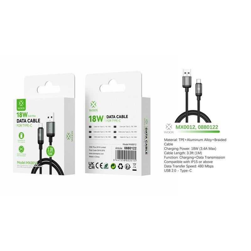 Woox MX0012 USB to Type C Braided Data Cable, 18W, 3.3ft 1m, Black