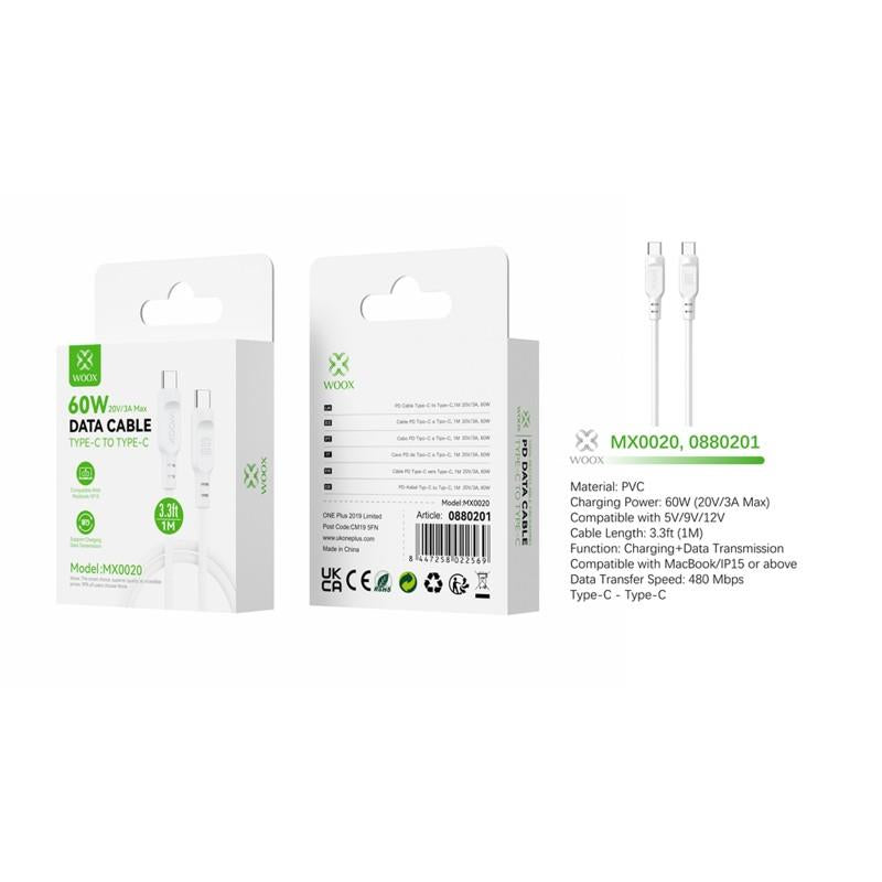 Woox MX0020 Type C to Type C PVC Data Cable, 60W, 3.3ft 1m, White